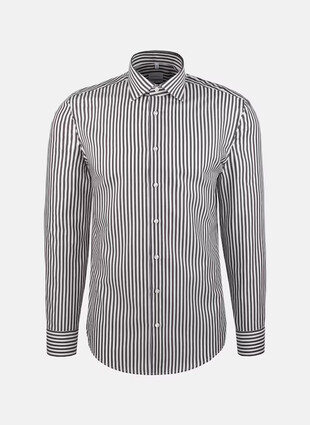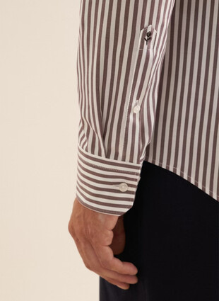 Приталенная мужская сорочка от немецкого бренда Seidensticker выполнена из высококачественного 100% мерсеризованного хлопка, который обеспечивает исключительную мягкость, легкий блеск и долговечность изделия. Яркая и выразительная вертикальная полоска в серо-коричневых тонах придает образу элегантность и современность, идеально подходит для деловых встреч и повседневных стильных образов.
