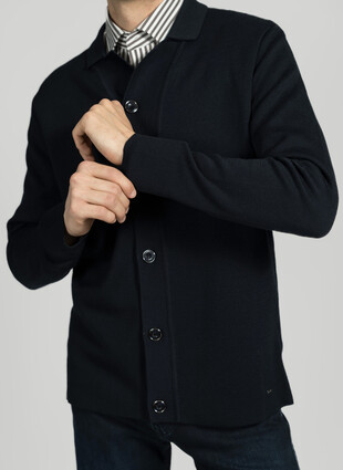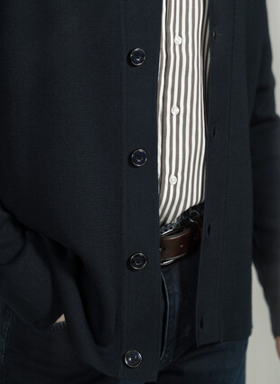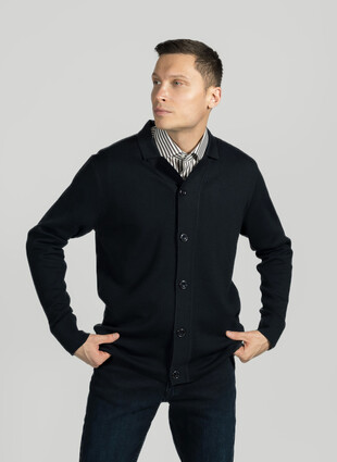 Кардиган на пуговицах от итальянского бренда Enrico Cerini выполнен из 100% шерсти чернильно-синего цвета. Элегантная модель с классической застежкой на пуговицы отличается аккуратным кроем и насыщенным насыщенным оттенком, который легко сочетается с различными гардеробными предметами. На пуговицах аккуратно прописан бренд, что подчеркивает высокий статус изделия. Этот кардиган отлично подойдет для создания стильных и уютных образов в холодную погоду, сочетая комфорт и изысканный дизайн. 100% мериносовая шерсть