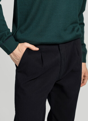 Слаксы от итальянского бренда Enrico Cerini выполнены в насыщенном темно-синем цвете и созданы для комфортного и стильного повседневного образа. Модель с защипами добавляет элегантности и оригинальности дизайну, а легкое занижение к низу создает модную силуэтную линию. Изготовлены из мягкой, бархатистой ткани с мелким рубчиком, которая приятна на ощупь и обеспечивает высокий уровень комфорта. Эти слаксы отлично подходят для создания современного образа в стиле casual и подчеркнут изысканный вкус своего владельца.70% хлопок, 27% модал, 3% эластан